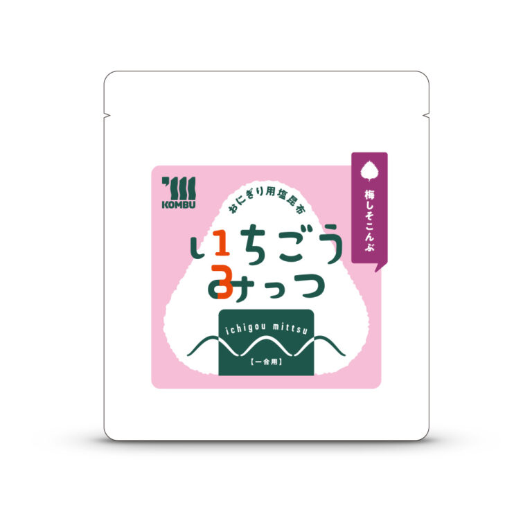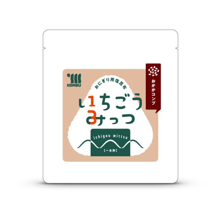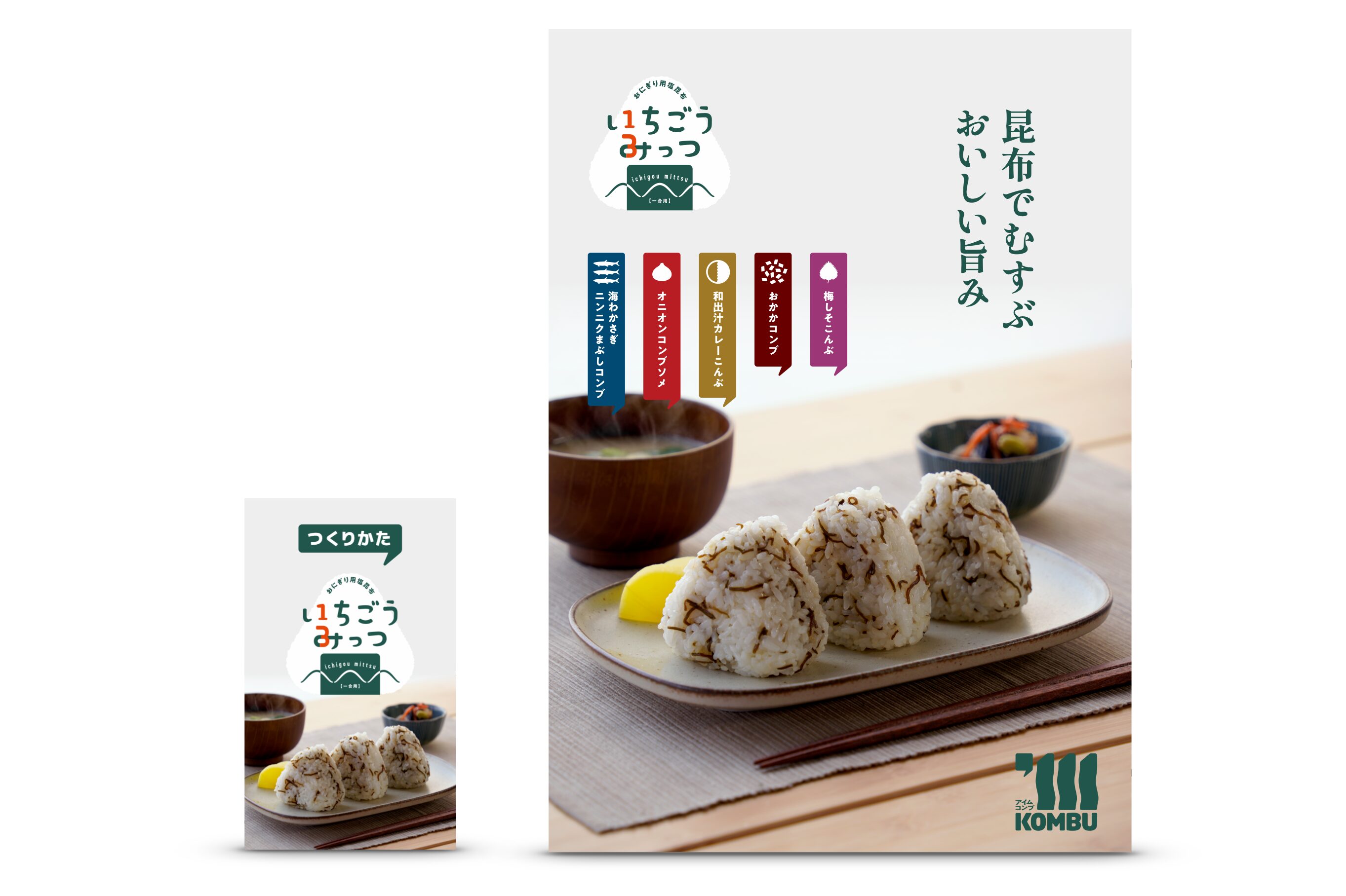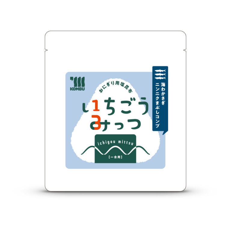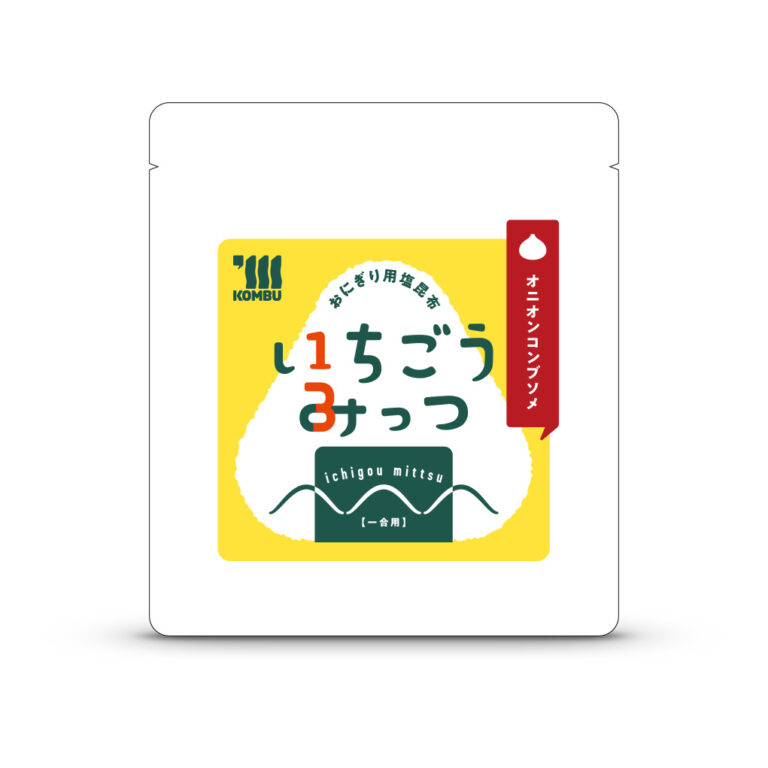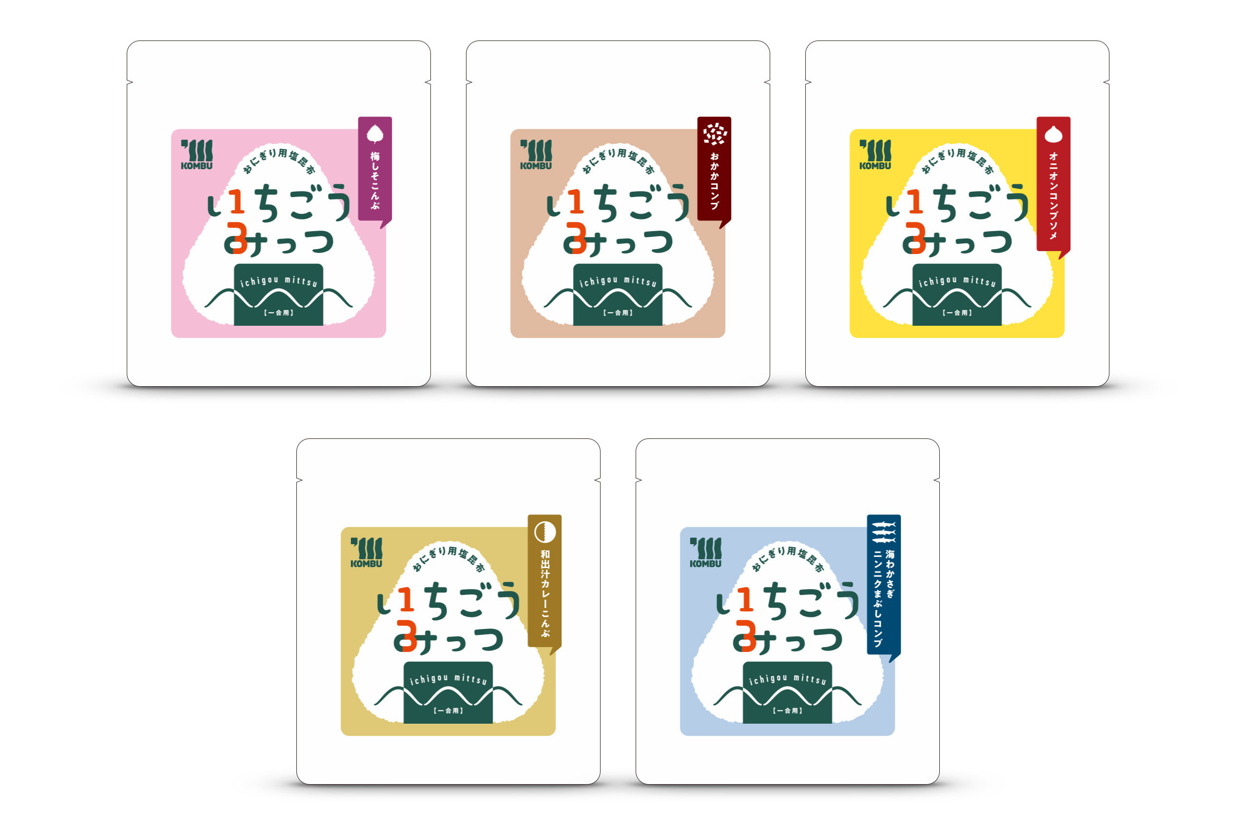 商品名は「いちごうみっつ」とし、1合で3つ分のおにぎりが作れる分かりやすさを付加価値としました。「昆布でむすぶおいしいうまみ」を商品コンセプトに5種の味展開を計画。おにぎりの定番「梅しそこんぶ」や「おかかコンブ」から、こどもが大好きな味の「オニオンコンソメ」や「和出汁カレーこんぶ」、思わず食べてみたくなる「海わかさぎニンニクまぶしコンブ」まで、こだわりと遊び心あふれるネーミングを考案しました。