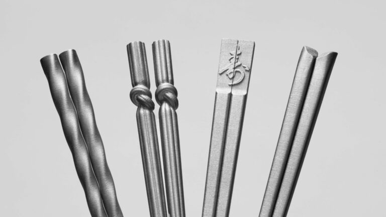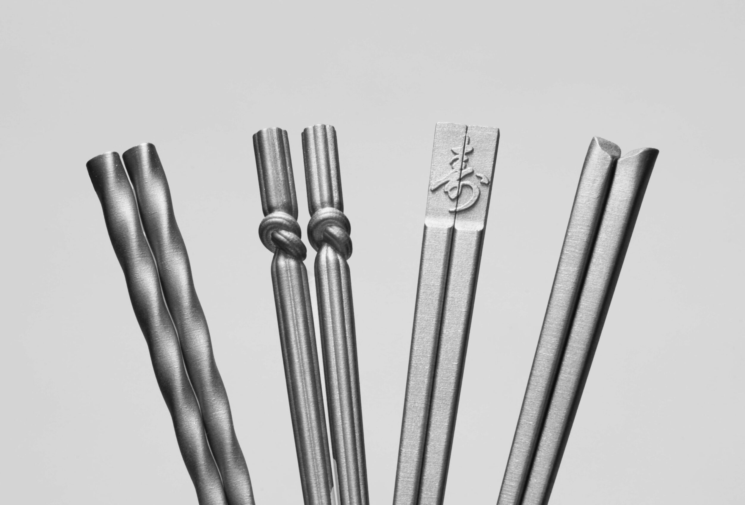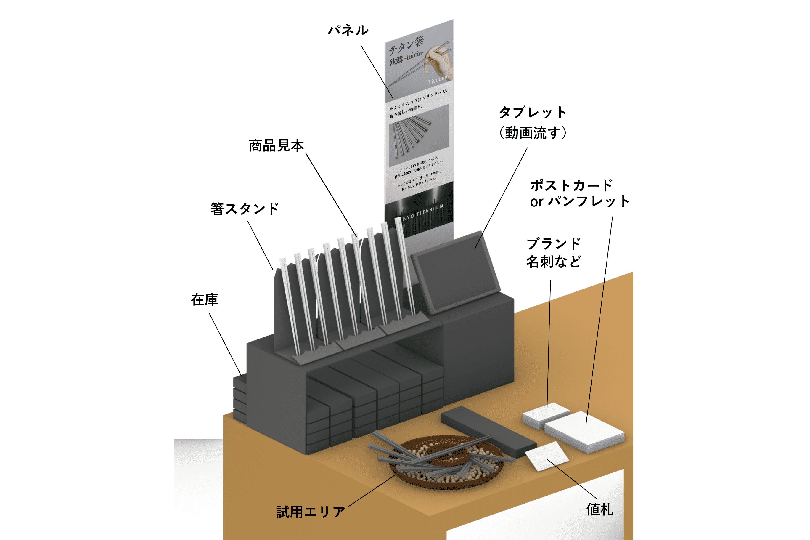 複数案から絞り込み、最終的には「渦潮」などのチタン製箸のデザインと、展示会用のパネル・ディスプレイレイアウトを制作。金型では製造できない3Dプリンターならではの自由な造形を活かし、高級感と独自性を表現しました。